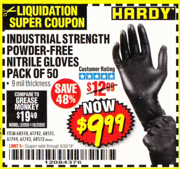 HARDY 9 mil Nitrile Powder-Free Gloves Medium - 50 Pc ... - Item 68510 / 61742 / 68511 / 61744 / 68512 / 61743 - Harbor Freight Coupons HARDY 9 mil Nitrile Powder-Free Gloves Medium - 50 Pc. - Item 68510 / 61742 / 68511 / 61744 / 68512 / 61743 Nitrile gloves provide better chemical resistance than latex and won't trigger latex allergies.