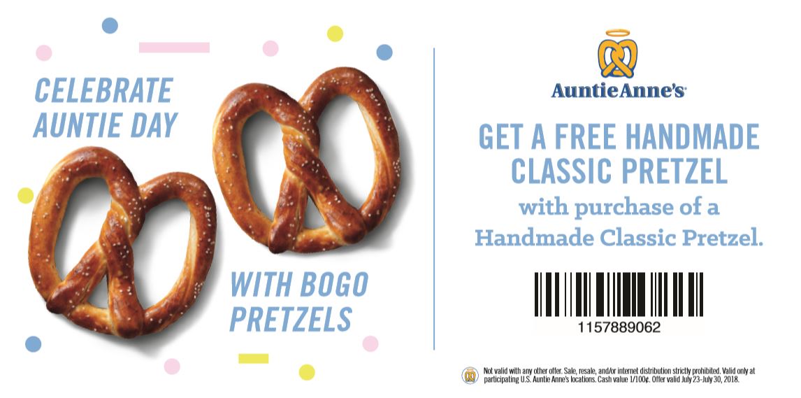 › auntie-annes-bogo-pretzelAuntie Anne’s | BOGO Pretzel Coupon :: Southern Savers Aug 29, 2020 · Download the Auntie Anne’s app to get a buy one get one free pretzel coupon. After you make your first purchase of at least $1 through the app, you will receive a coupon for a Free Pretzel. They are also offering more special rewards and offers with their app, so don’t miss out. Offer valid through 8/31. See more Freebies.